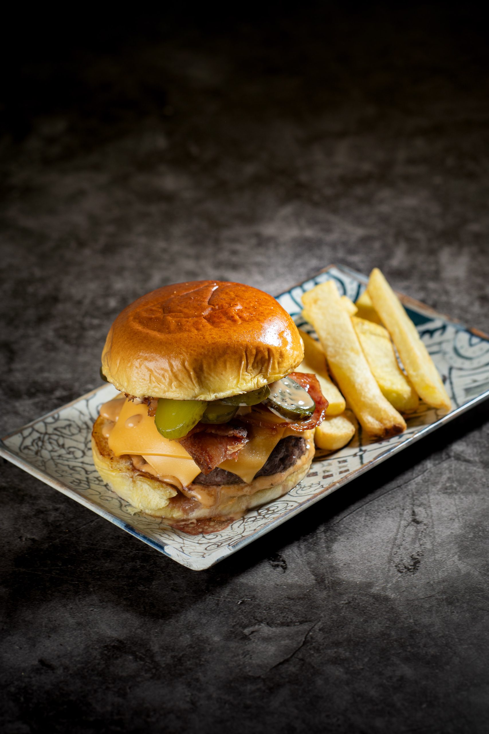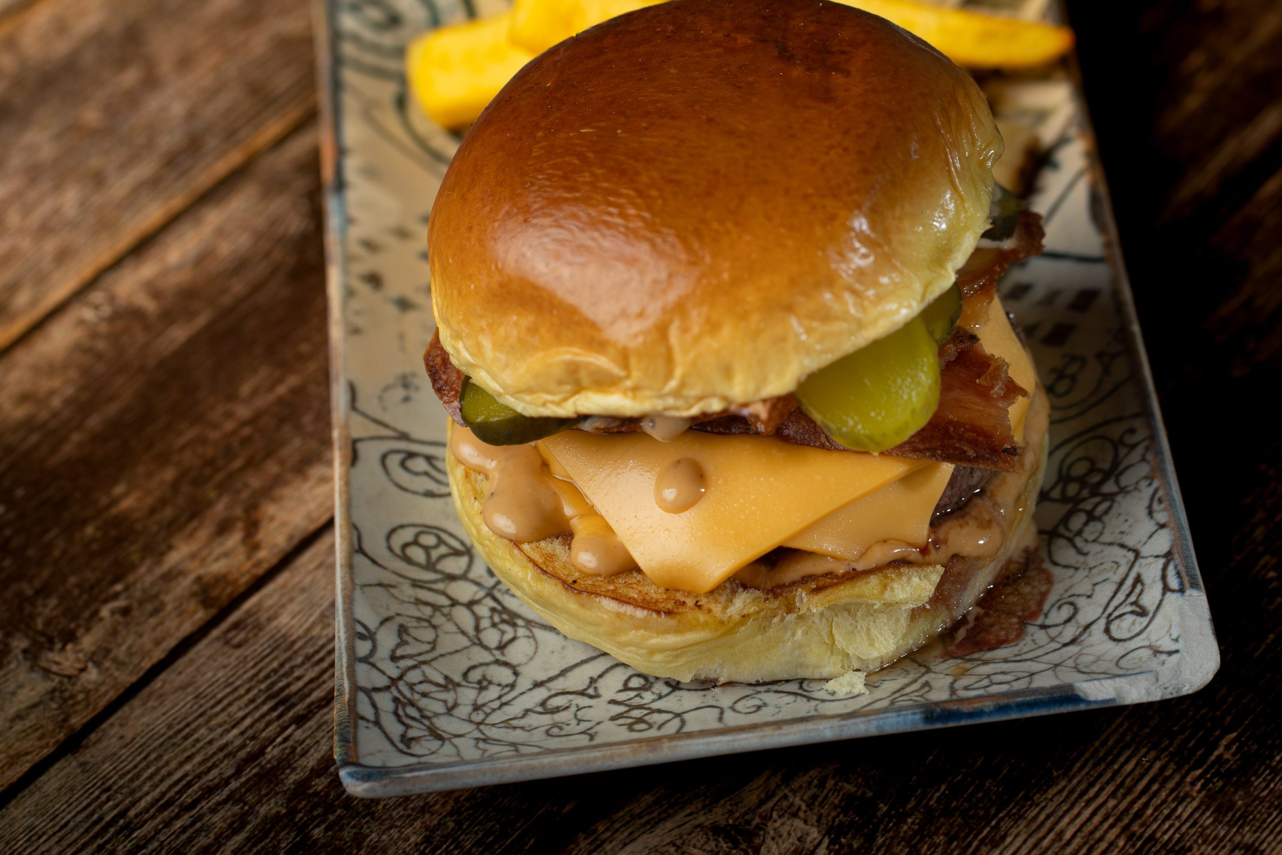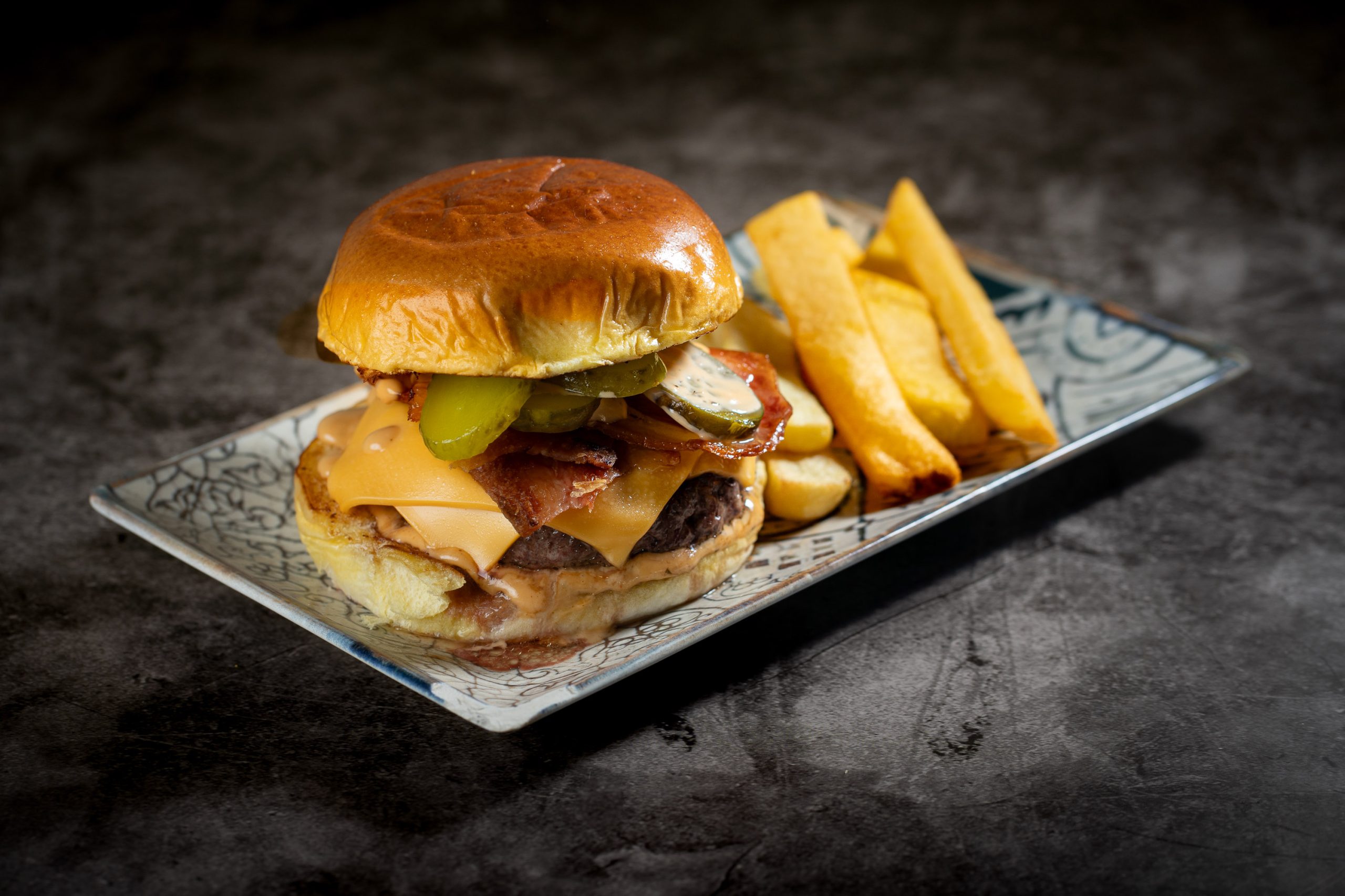 Carne, doble de queso, doble de bacon, salsa burger y pepinillos.