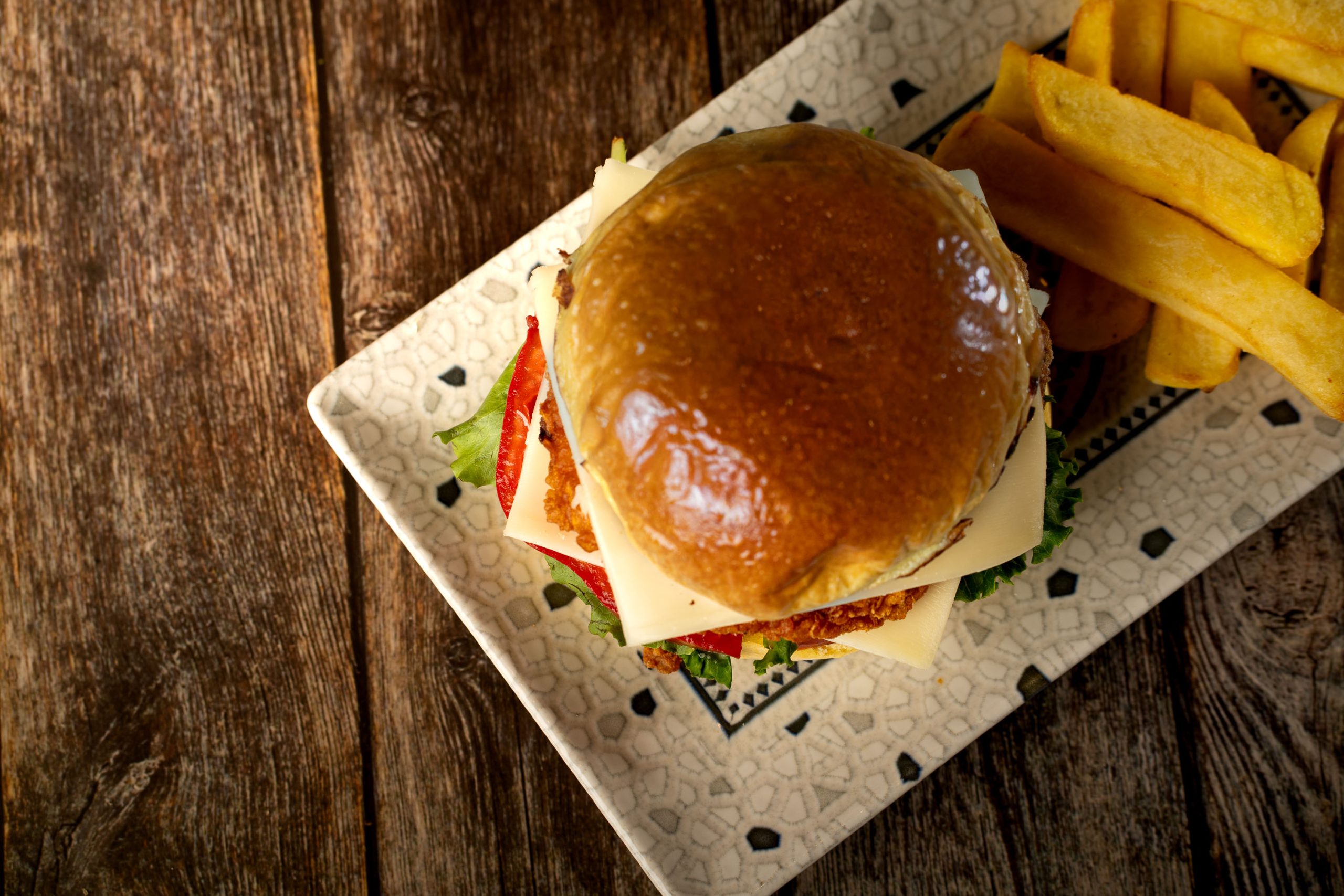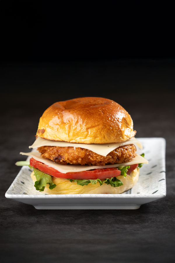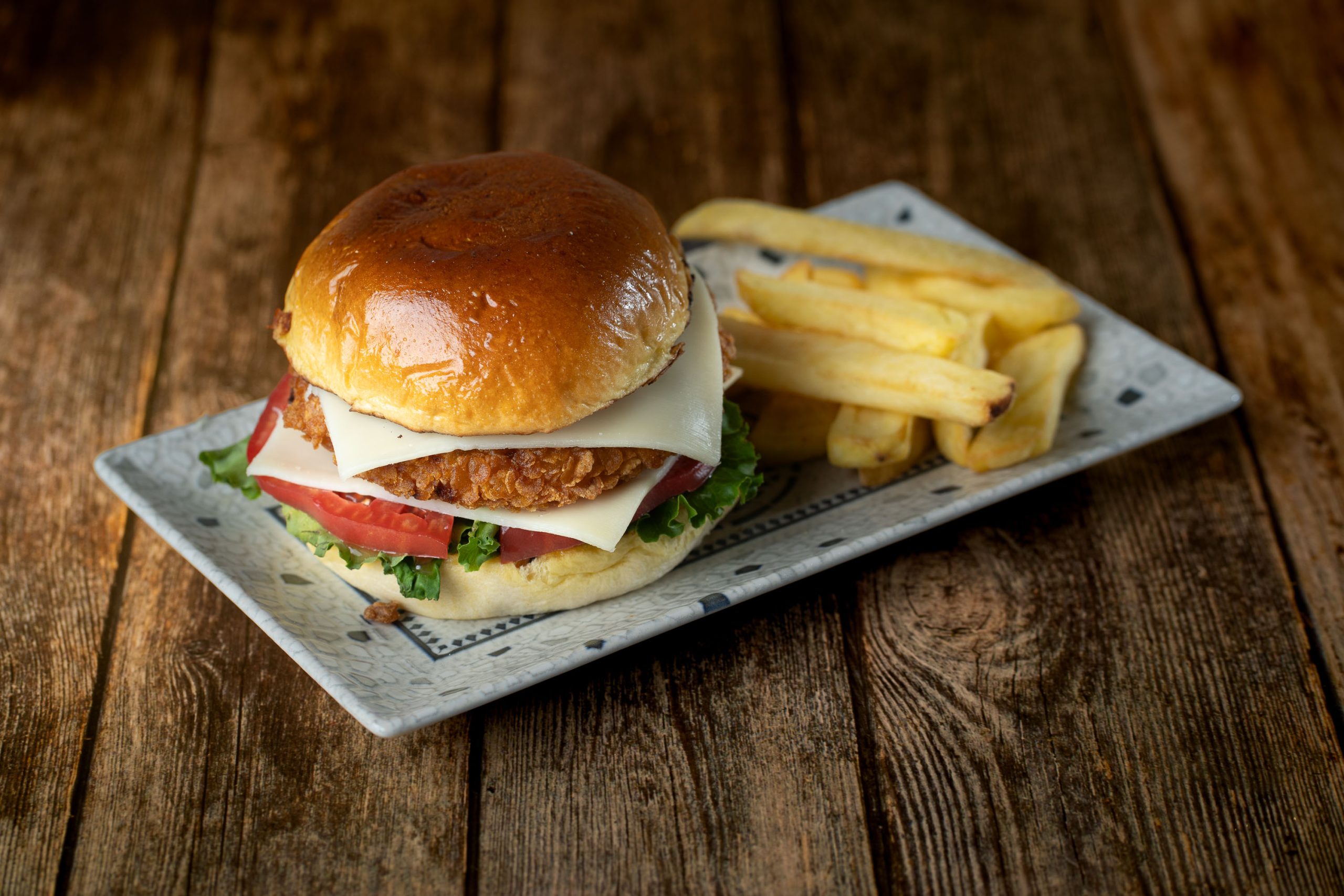 Pollo empanado, lechuga, tomate y queso