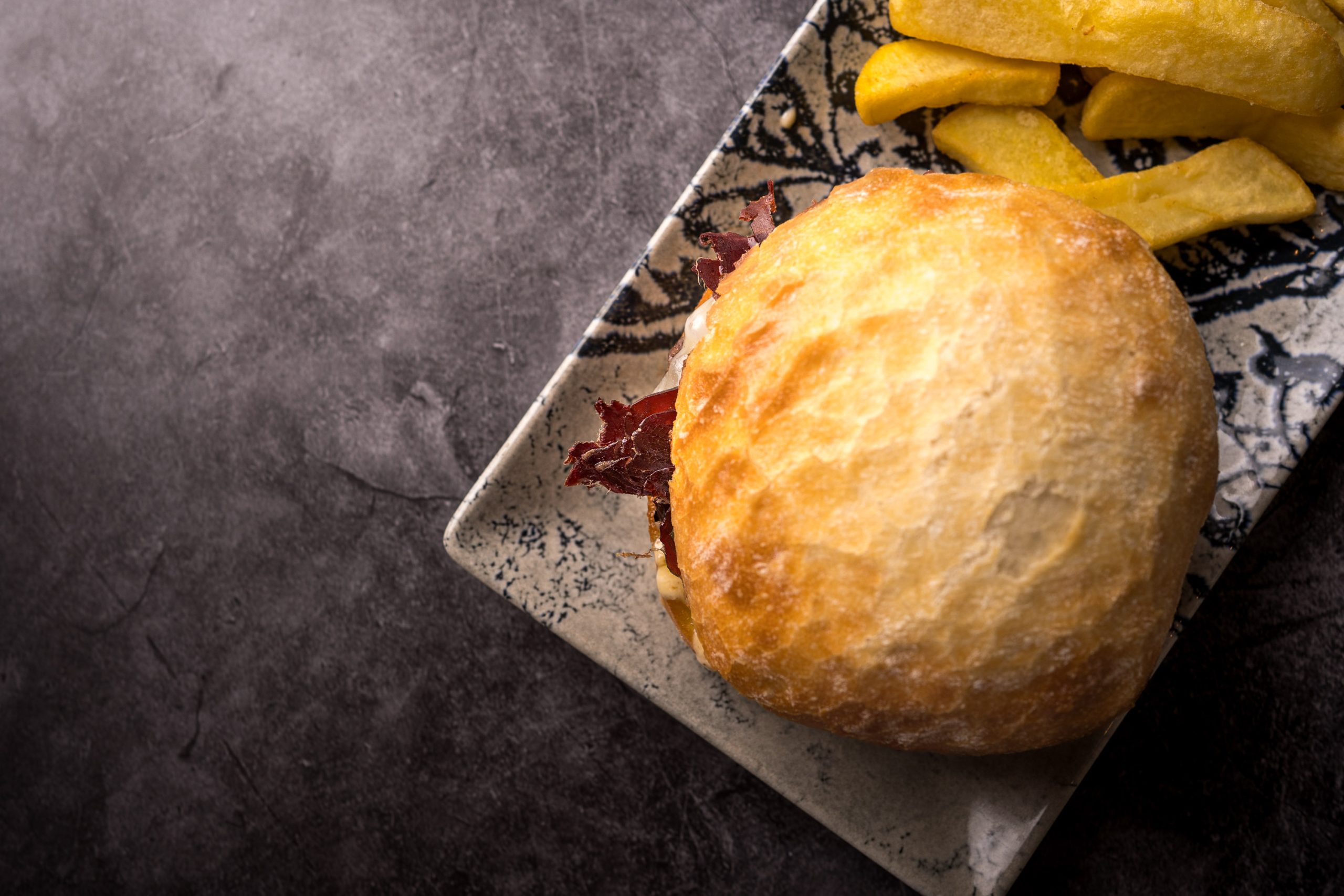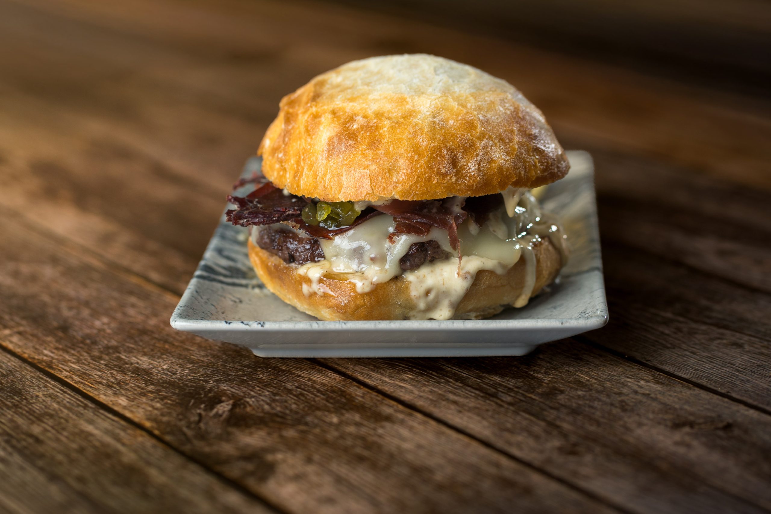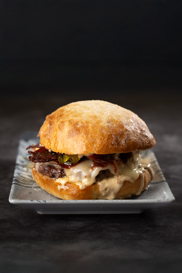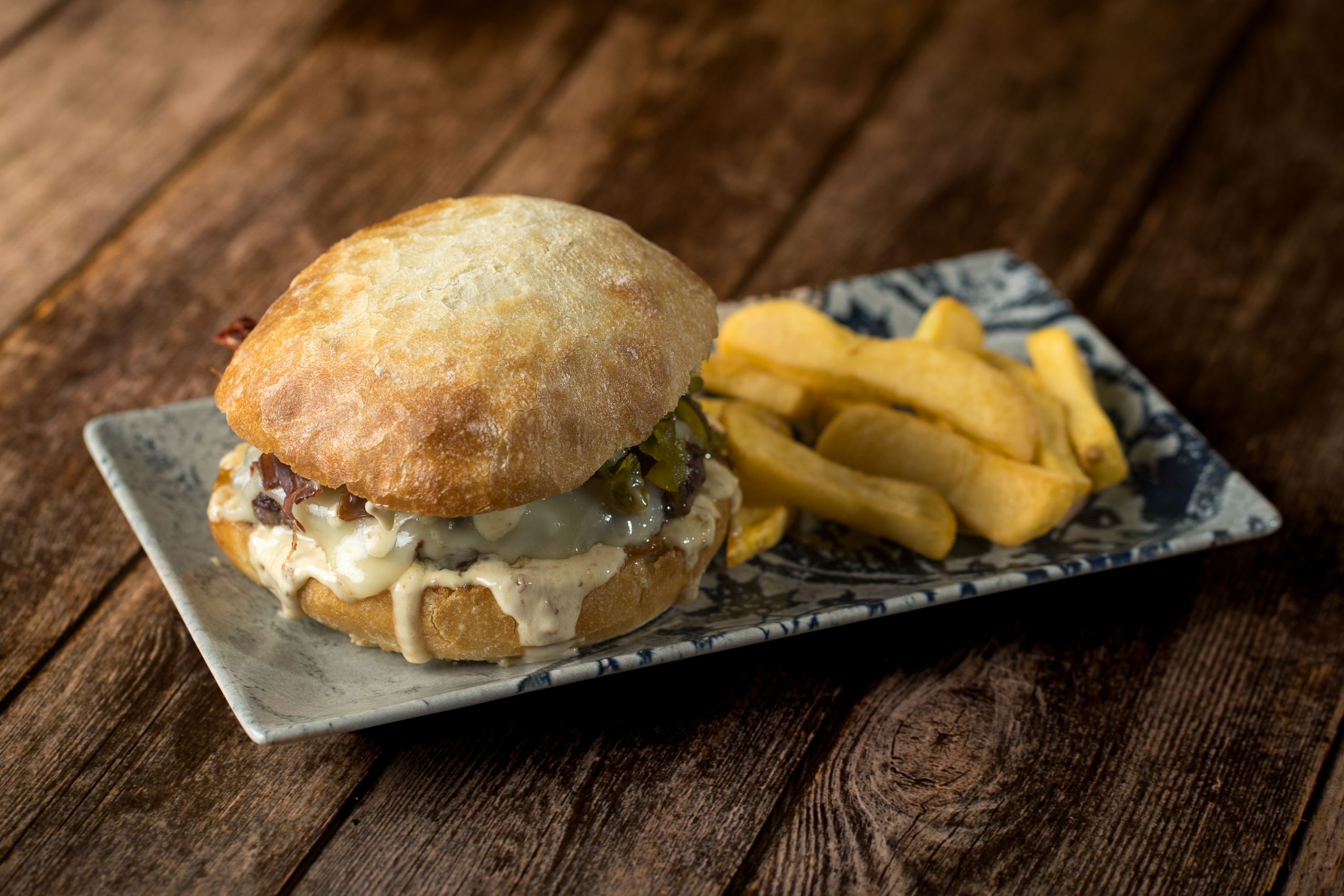200gr de carne de Buey(Bodegas el capricho-certificado), queso monterrey Jack, cecina y piparra ahumada.